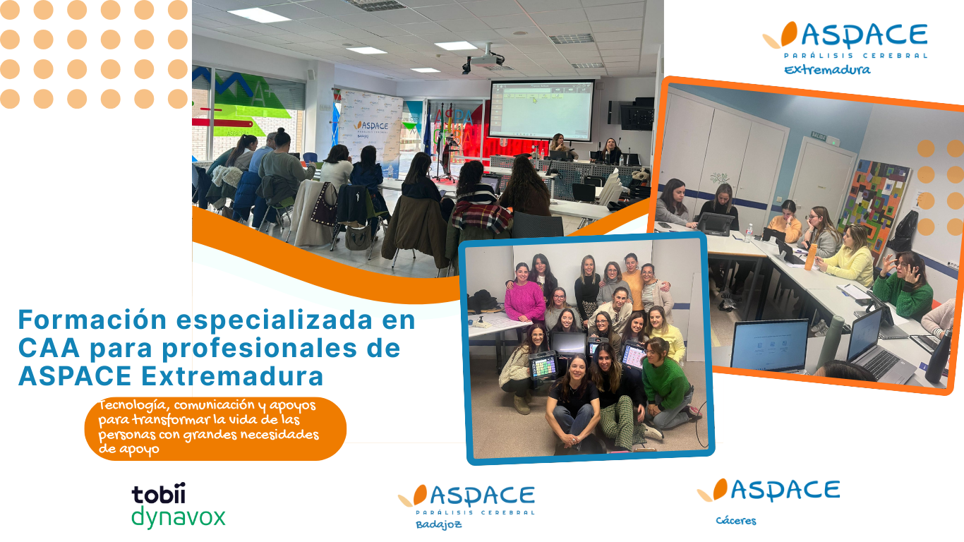 Durante los días 22 y 23 de enero, un total de 30 profesionales de las entidades ASPACE Cáceres y ASPACE Badajoz han participado en una formación presencial especializada en Comunicación Aumentativa y Alternativa (CAA), organizada por la Federación Extremeña ASPACE y ofrecida por Tobii Dynavox, empresa de referencia internacional en tecnología de apoyos para la comunicación.