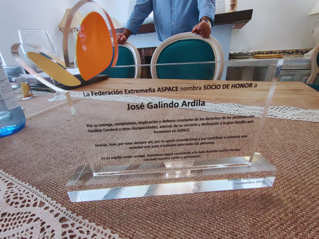 La Federación Extremeña ASPACE ha nombrado como Socio Honorífico a José Galindo Ardila, en reconocimiento a su compromiso, entrega y defensa activa de los derechos de las personas con parálisis cerebral y otras discapacidades afines en Extremadura.